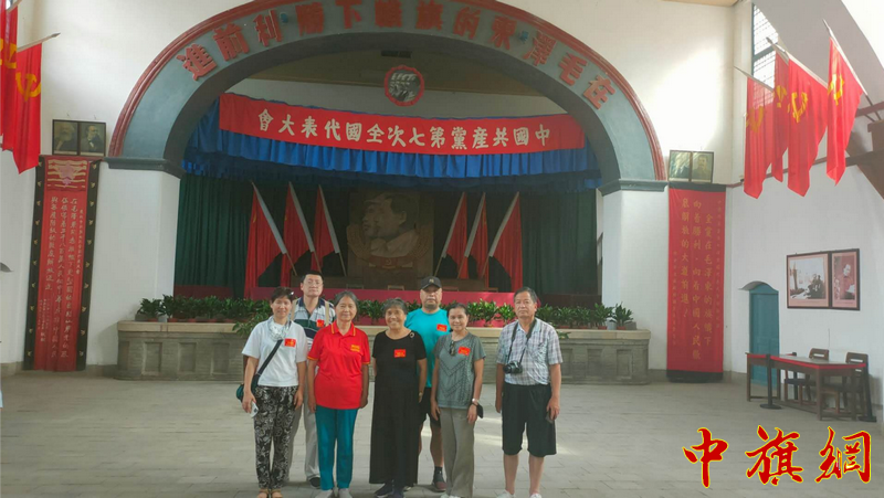 寻访团团员在党的七大旧址合影。左起:侯巧荣、陈海风、罗解难、张克明、胡承勇、龙承英、暴朋振