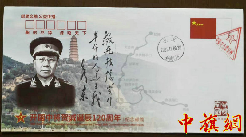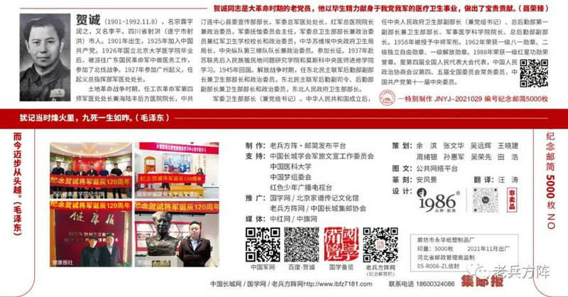 11月8日,在中国共产党第十九届六中全会召开之际,《开国中将贺诚诞辰120周年》纪念邮简悄然问世。这一天,也是贺诚去逝29周年。由中国梦组委会和中国长城学会军旅文化宣传工作委员会共同策划、老兵方阵·邮简发布平台推出的这套编号为JNYJ-2021029的邮简,是开国将帅元勋系列纪念邮简中的第一套开国中将邮简,共编号印制5000枚。