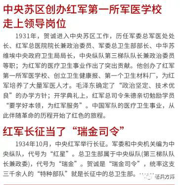 贺诚是大革命时期的老党员,参加过北伐战争和广州起义、上海和武昌地下工作,在中央苏区创办了红军第一所军医学校并走上领导岗位,长征途中因带领人员最多的军委总卫生部而被称之”瑞金司令“。作为人民军队和新中国医疗卫生事业的领导者和奠基人,“他以毕生精力献身于我党我军的医疗卫生事业,做出了宝贵贡献”(聂荣臻元帅评价)。