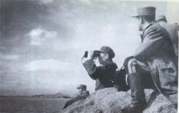 ◆1953年春反登陆作战准备时,邓华在朝鲜人民军军官陪同下,视察朝鲜海防,持望远镜者为邓华。