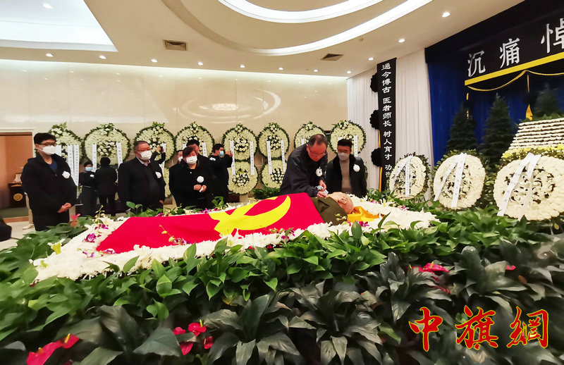 涂通今同志的遗体安卧在鲜花翠柏丛中,身上覆盖着鲜红的中国共产党党旗。