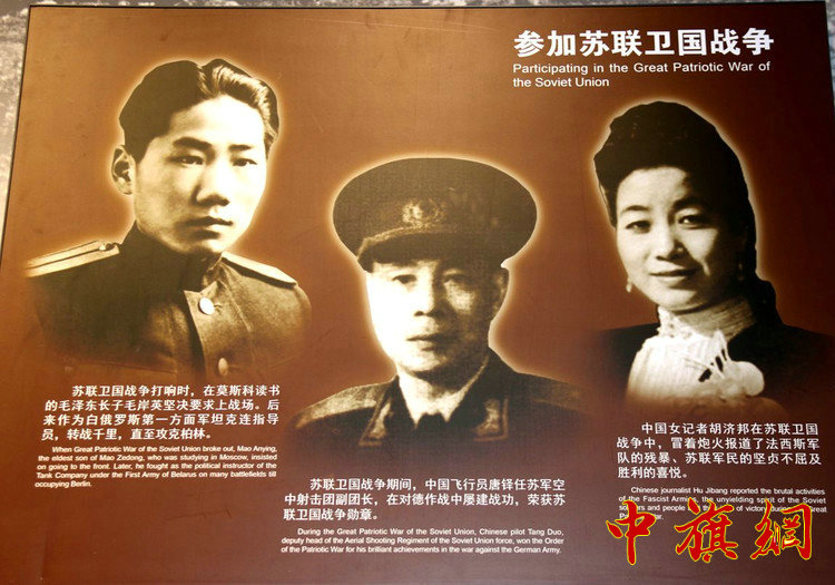 《中国人民抗日战争纪念馆》的参加苏联卫国战争的反法西斯国际主义战士。左起:毛岸英、唐铎、胡济邦。
