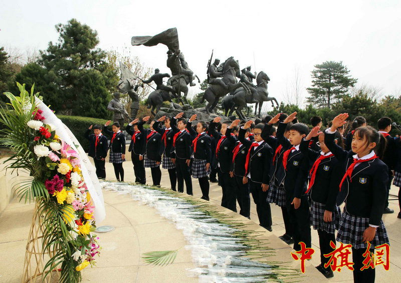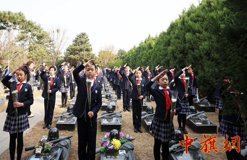 北京市史家胡同小学和景山学校远洋分校以及“旗帜小记者团”上百名少先队员代表青少年向烈士园数百座烈士墓碑敬献鲜花