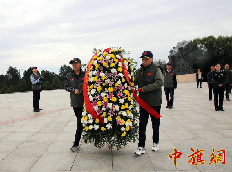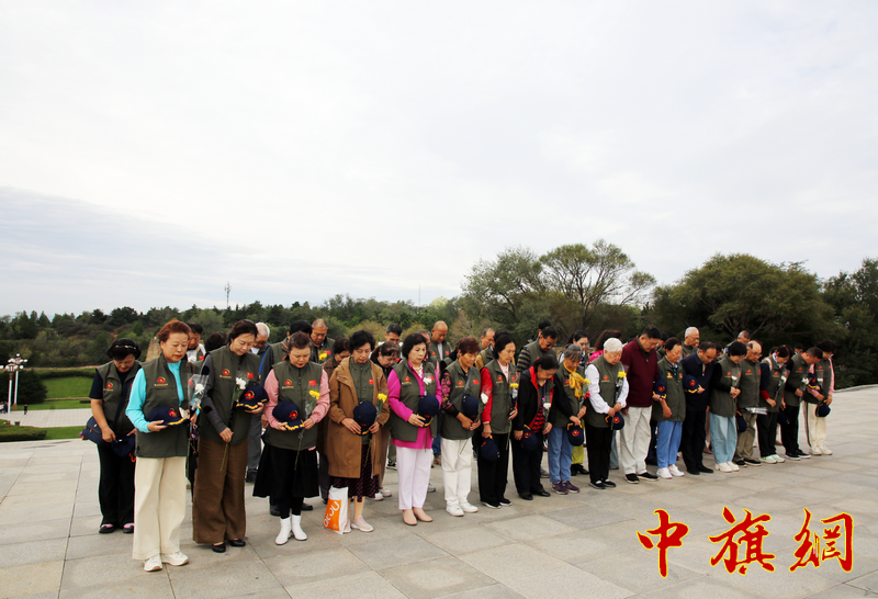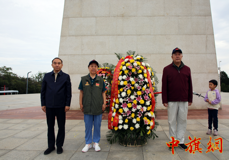 在娘子关绵山革命烈士纪念碑前,寻根之旅成员敬献花篮,奏唱国歌。