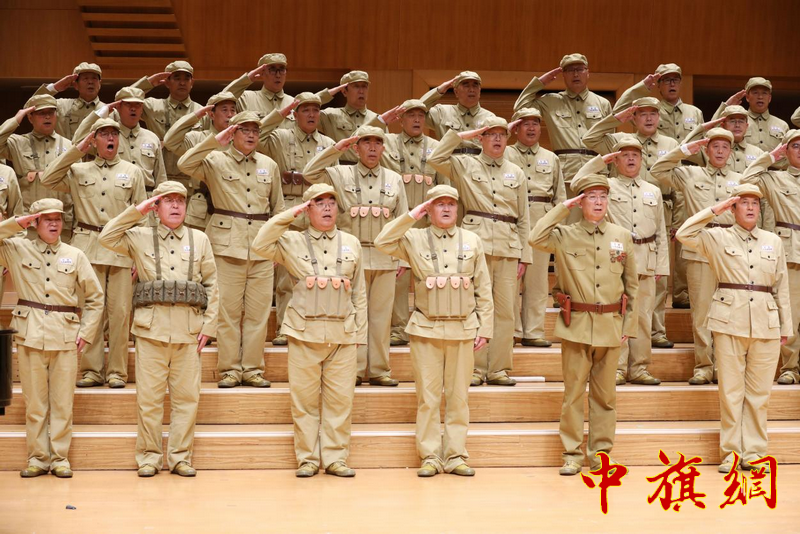 音乐会最撼动人心的是九位志愿军老战士亲临现场观看演出,动情处,他们一起高歌。