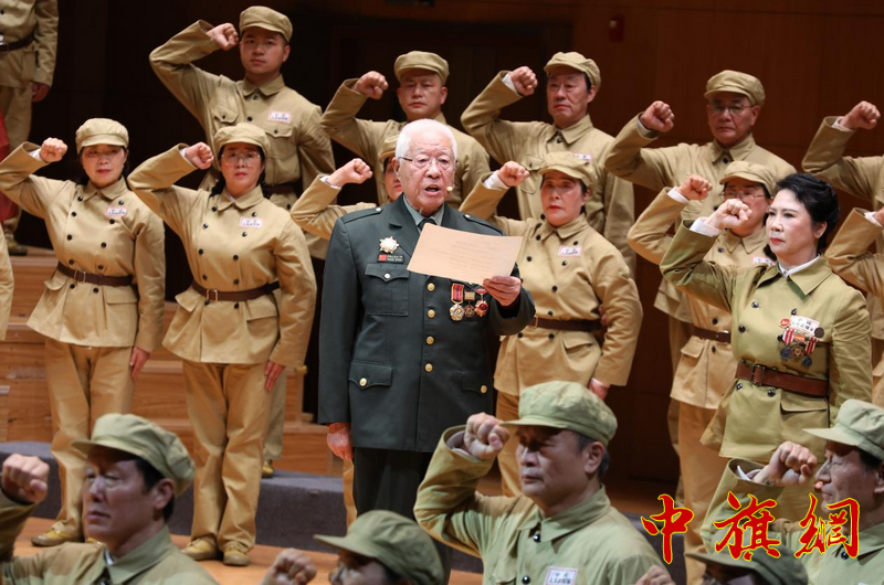 志愿军老战士曹家麟带领现场演员重温《志愿军出国作战誓词》,“不怕流血牺牲,敢于攻坚克难” 的誓言掷地有声。(摄影 郭海鹏)