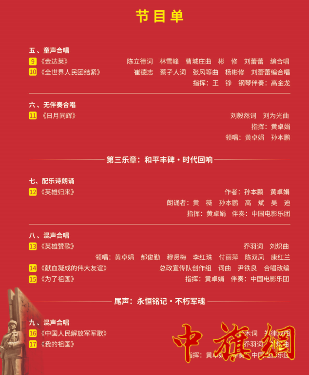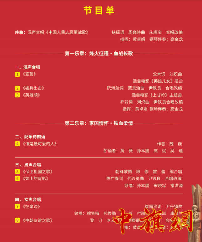 第一乐章聚焦志愿军浴血奋战的场景,混声合唱《宣誓》(电影《英雄儿女》插曲)、《雄兵出击》(电影《上甘岭》插曲)等曲目,再现了志愿军 “雄赳赳气昂昂跨过鸭绿江” 的豪迈与 “钢少气多力克钢多气少” 的英勇;第二乐章通过配乐诗朗诵《谁是最可爱的人》(魏巍原作)、男声合唱《如山的背影》、童声合唱《金达莱》等节目,展现家国情怀与中朝友谊,其中无伴奏合唱《日月同辉》以空灵旋律缅怀 197653 名埋骨异国他乡的志愿军烈士;第三乐章以音乐诗朗诵《英雄归来》开篇,混声合唱《英雄赞歌》《为了祖国》等曲目升华主题,压轴的《中国人民解放军军歌》《我的祖国》更是将现场气氛推向高潮,全场观众自发跟唱,热泪与掌声交织。