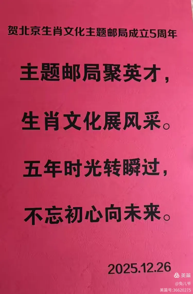 五年,是一个里程碑,更是一个新起点。方寸邮票,不仅承载着通信的功能,更成为了记录时代、传承文明、联络情感的独特载体。北京生肖文化主题邮局用五年的时光证明,传统文化并非静止的遗产,而是可以通过创新表达,在当代生活中持续跳动、散发温暖的“活”的精神血脉。从这里出发,生肖文化的故事,还将在一枚枚邮戳、一封封信笺中,不断续写新的篇章。