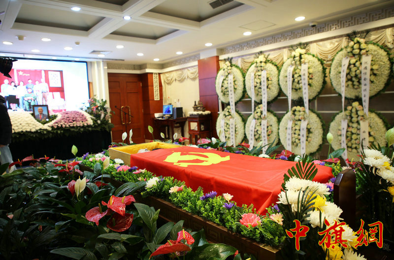 曲琪玉同志的遗体覆盖着鲜红的中国共产党党旗,安卧在鲜花翠柏丛中