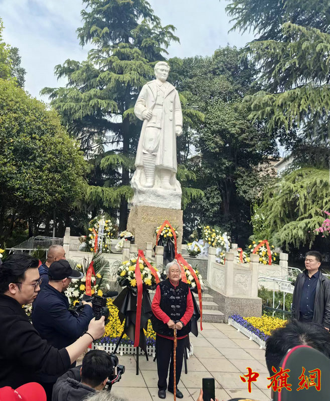 2026年4月12日,纪念红军东征暨刘志丹将军牺牲九十周年追思会、座谈会在西安召开。图为女儿刘玉兰在父亲刘志丹雕像前讲话。