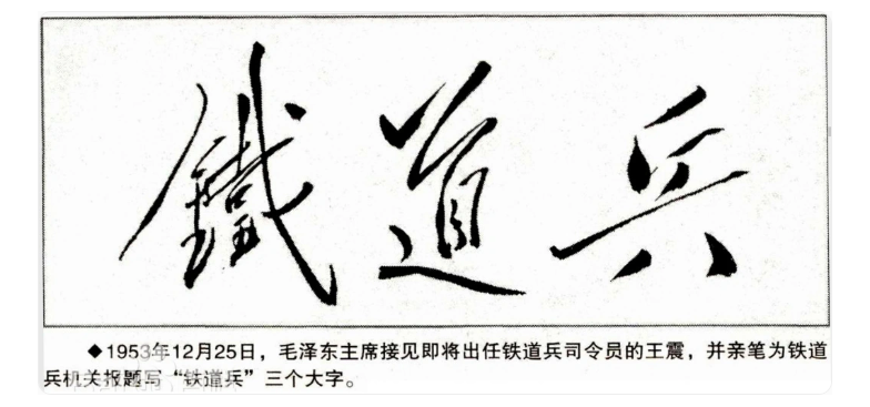 1953年12月25日,毛泽东主席接见即将出任铁道兵司令员的王震,并亲笔为铁道兵机关报题写:“铁道兵”三个大字。